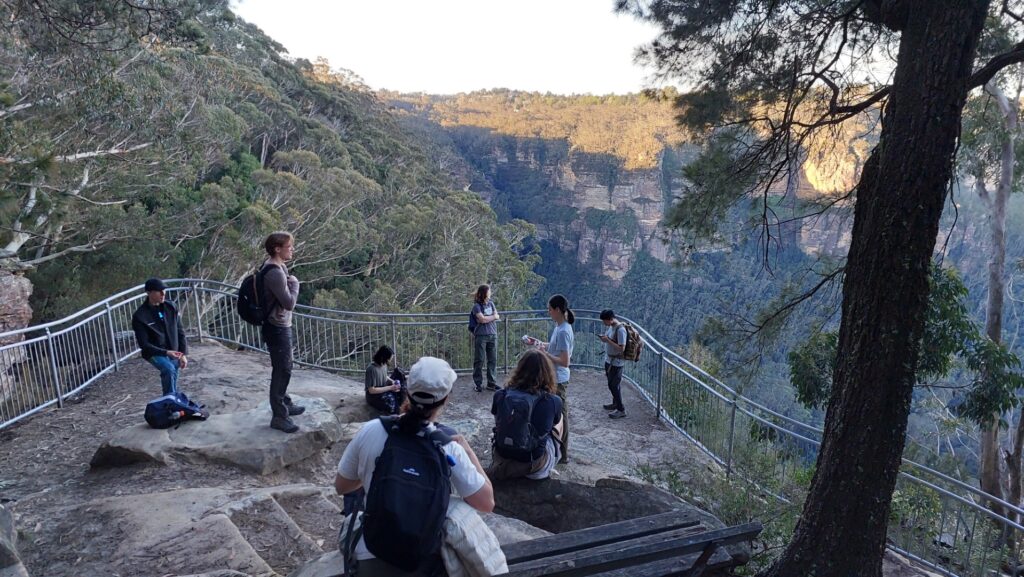 The night walk’s lights come on just as we pass Katoomba Falls, and I took an impromptu swim to celebrate (definitely didn’t slip). We pass the lovely Orphan Rock lookout where I’m given 60 seconds to impart a short history lesson, before we continue along the final stretch to Scenic World!