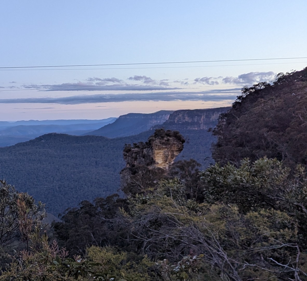 We make it to Echo Point right as the sun starts to set, about 30 minutes ahead of schedule! The original plan was for this next 2km section of the walk to be in the dark, leveraging the Katoomba Falls Night-lit Walk, however we got to enjoy the pinkening sky instead.