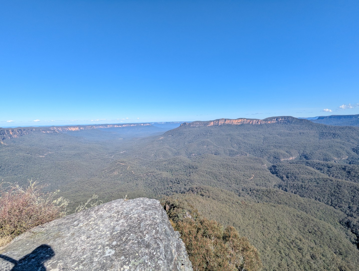 We’re treated to our first view of the Jamison Valley now, through the narrow cleft carved through by the eponymous Jamison Creek. We are about to become very well acquainted with this valley, as the rest of the walk skirts this very cliff top (who would have guessed).