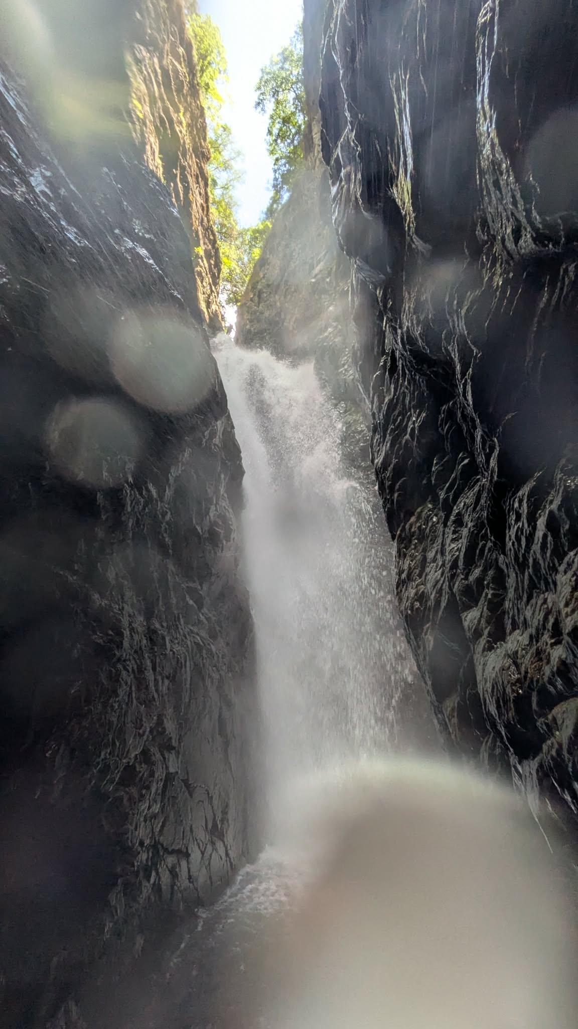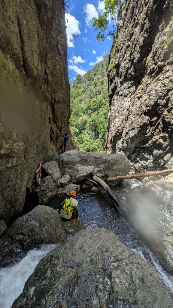 The next drop was BIG, we set up a traverse line and got a look down the money pitch, a massive 40 metre abseil in full flow. I managed the hanging belay and watched each member of the group enjoy a good rinsing in the flow. Finally it was my turn to descend, I disassembled the traverse line and cleaned the anchor. Just 1.5 metres from the bottom of the pitch the pull strand goes taught, I need to join ropes! While getting absolutely smashed by the water I lock off my descender, grab the end of my rope and tie it to the pull strand. I was relying on muscle memory to do this as I had to look down to create an air bubble so I could breathe! Finally I finish abseiling and escape the flow. I pull the ropes and join the others at the next pitch.