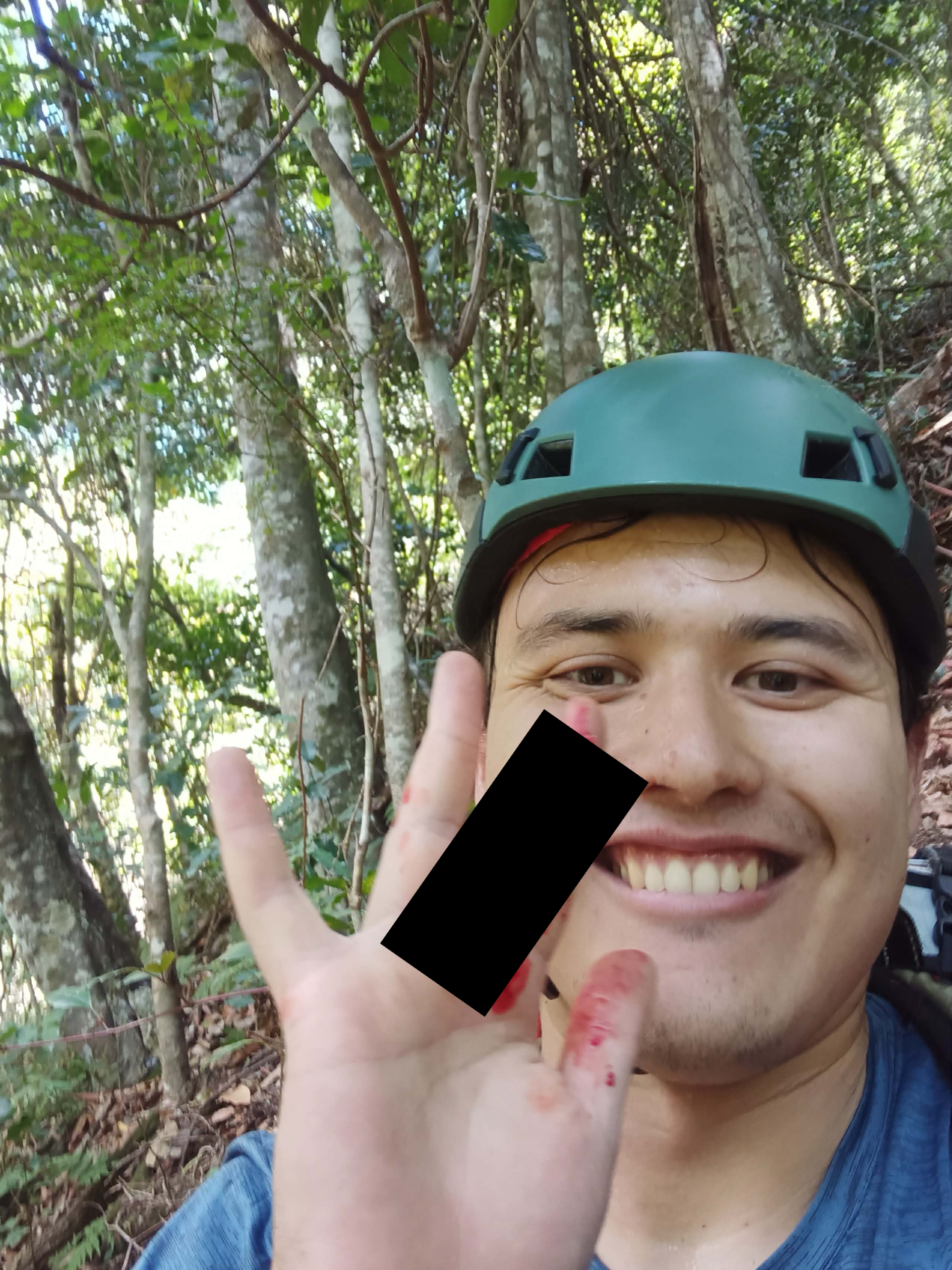 25 minutes into the walk out I use my left hand to grab a tree and pull myself up. I hear someone up ahead call “ROCK!”. I instantly feel a shockwave of pain through my hand and I scream, loudly. This scream would later be described to me as a “PLB scream”. I find my balance and look at my blood soaked hand, I can see the white of bone sticking out of what was left of my middle finger. The fingertip was barely holding on and was bent downwards. Unable to do much, I pull my phone out and snap a selfie. I call up to the people ahead “My finger’s broken!”, they reply, “Are you sure?”. After convincing everyone that I was really injured and that bones do in fact belong inside the body, we find some stable ground and start first aid.