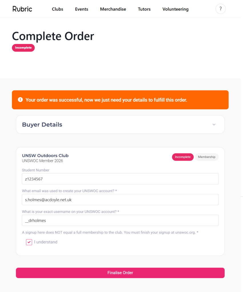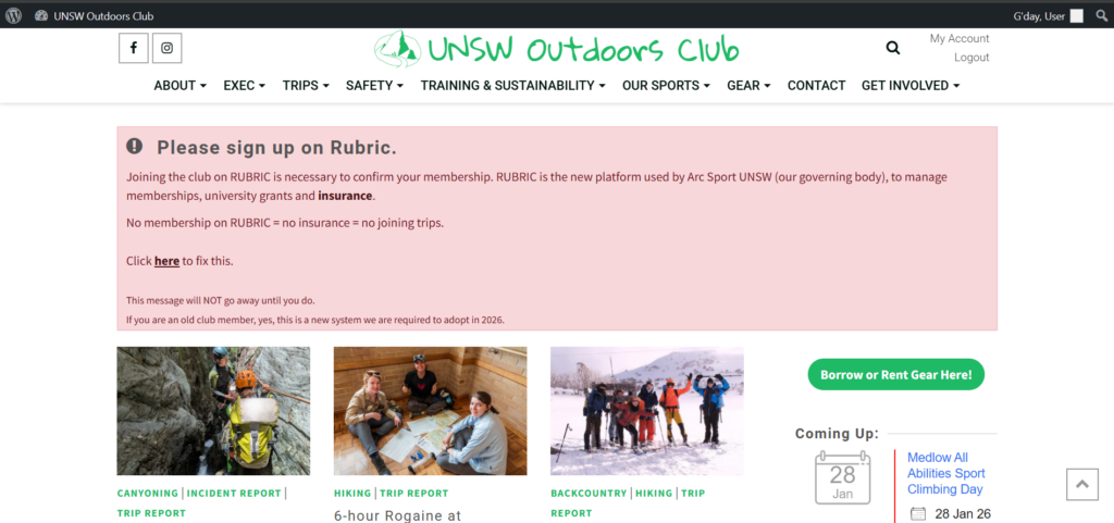 All UNSWOC members will need to sign up to Rubric, and get a club ""membership"" on Rubric. Once you do that, you will need to approve your Rubric membership at My Account – UNSW Outdoors Club. If the automatic form does not work, please contact the web officer.
