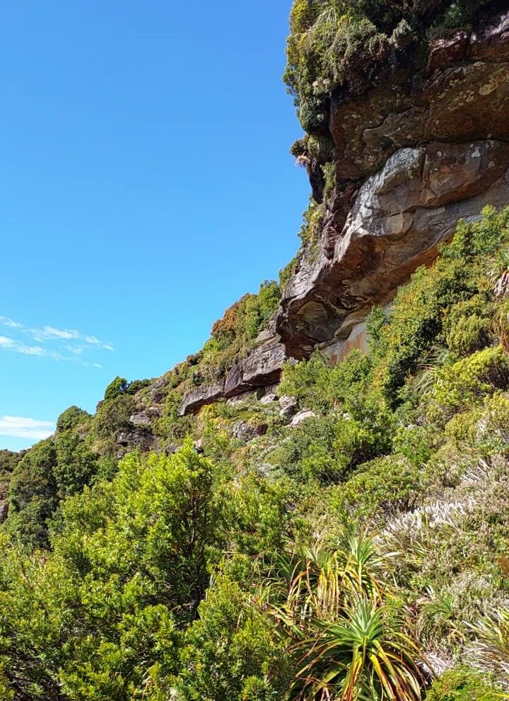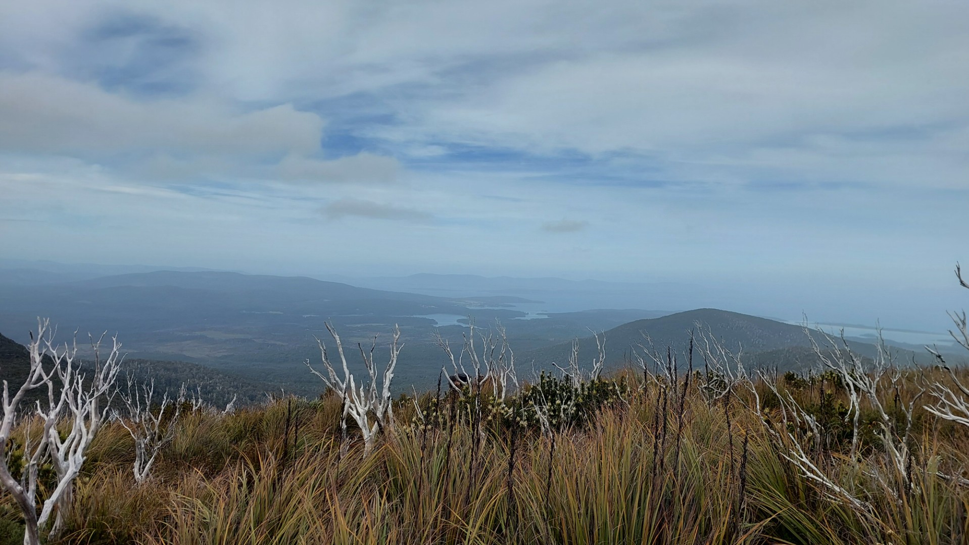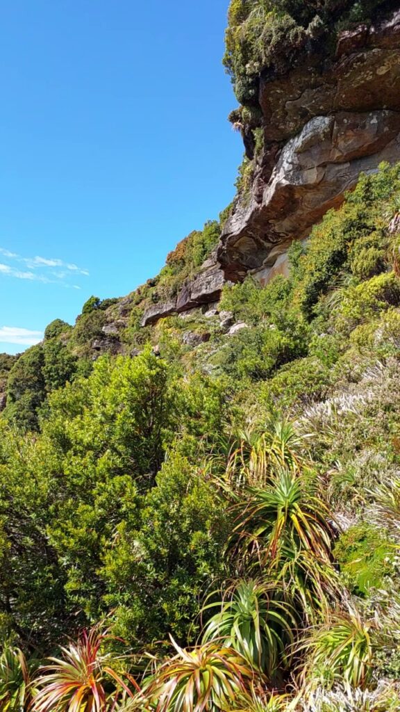 The steep climb gives way to a rocky escarpment traverse with some borderline rock scrambling while also affording us absolutely stunning views over the coastline, our destination (South East Cape), the Ironbound ranges, and New River Lagoon (day 6).