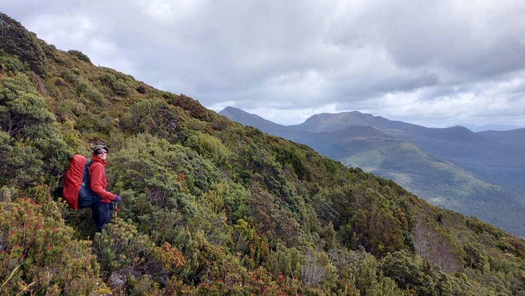 The Southern Ranges Traverse traverses a mountain range in the Southwest Tasmania National Park, culminating in the ascent of Precipitous Bluff. The track is notorious for several kilometres of unforgiving, unmaintained, untracked scrub, with strong navigation, scrambling, and hiking skills required.