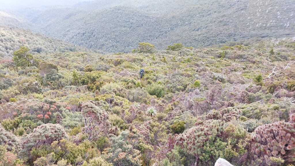 Scoparia and Tea Tree are the prevailing species in the first section, forming something akin to a shoulder-high ball pit filled with thorns. The benefit of this was whenever we wanted a break, we merely had to stop and lean slightly sideways. The scrub would catch us and provide genuinely one of the most comfortable standing rest positions, with added free acupuncture.