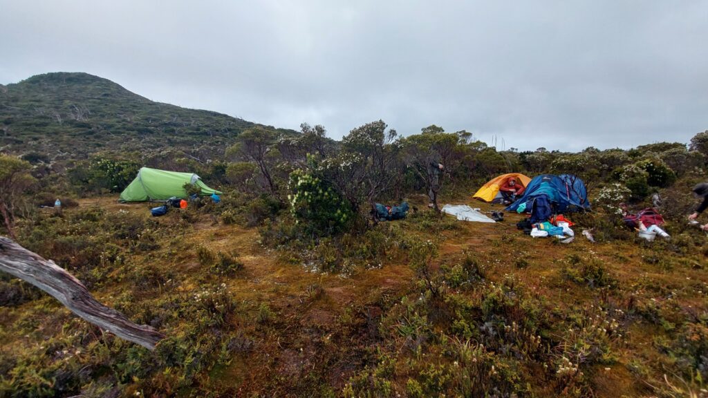 Our accommodation for the night is described as a "small, muddy campsite", and he is not wrong. Our bags sit on mudpatches and tent doors lead into swamp, however we get a nice flowing creek for water. Now is a good time to mention that when we chatted around (and I called a park ranger), we were told that the weather in Tasmania had been "Weirdly dry" over the past few weeks.
