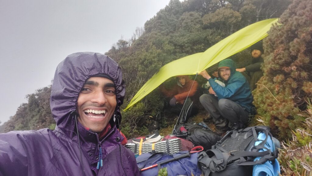 The group pauses on a somewhat stable section while I ask Thomas to help me find a spot on the Eastern side, sheltered enough from the winds for us to cower beneath a tarp until the weather settles.