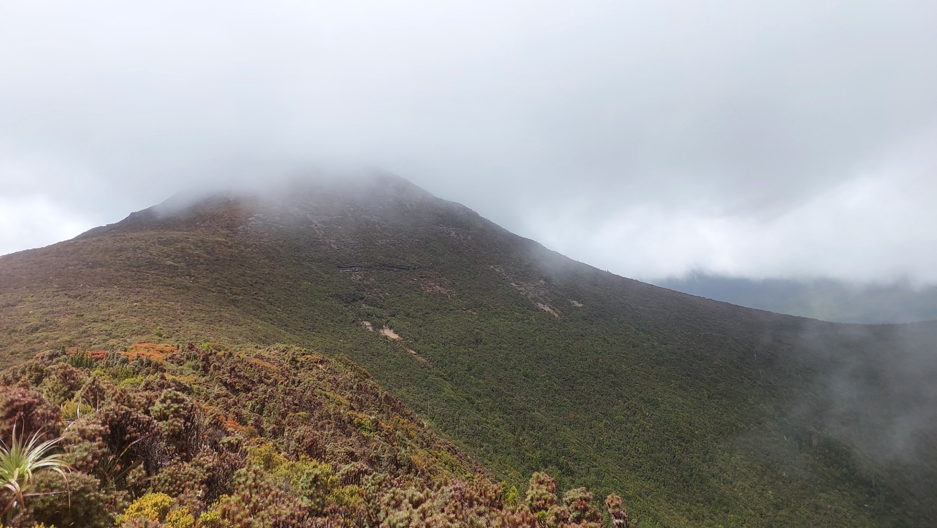 We are up on the Western face of Mt Wylly at 10:45am when I make the call that it is unsafe to continue. Crossing Mt Wylly any further is on unstable rocky slopes, on the prevailing side of the winds. We can barely stand up straight, nor can I see our destination through the rain haze.