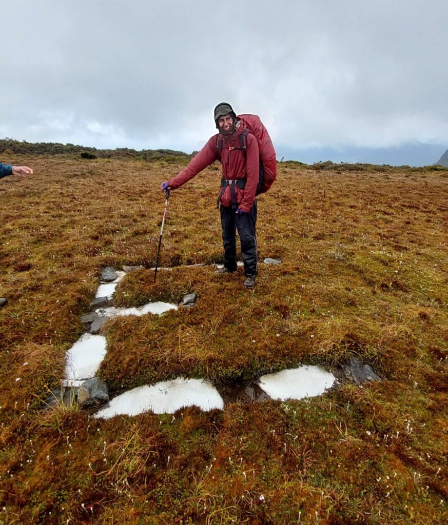 We wondered what situation Rowan was in – he left about 30 minutes before us in the morning and hopefully escaped the weather. By 12:30 the weather had calmed down enough to continue walking – but still not settled per se. We make it down Mt Wylly in record adrenaline-filled time, past a weird plastic “E” cut into the ground, and to yet another lunch nestled in the bushes.