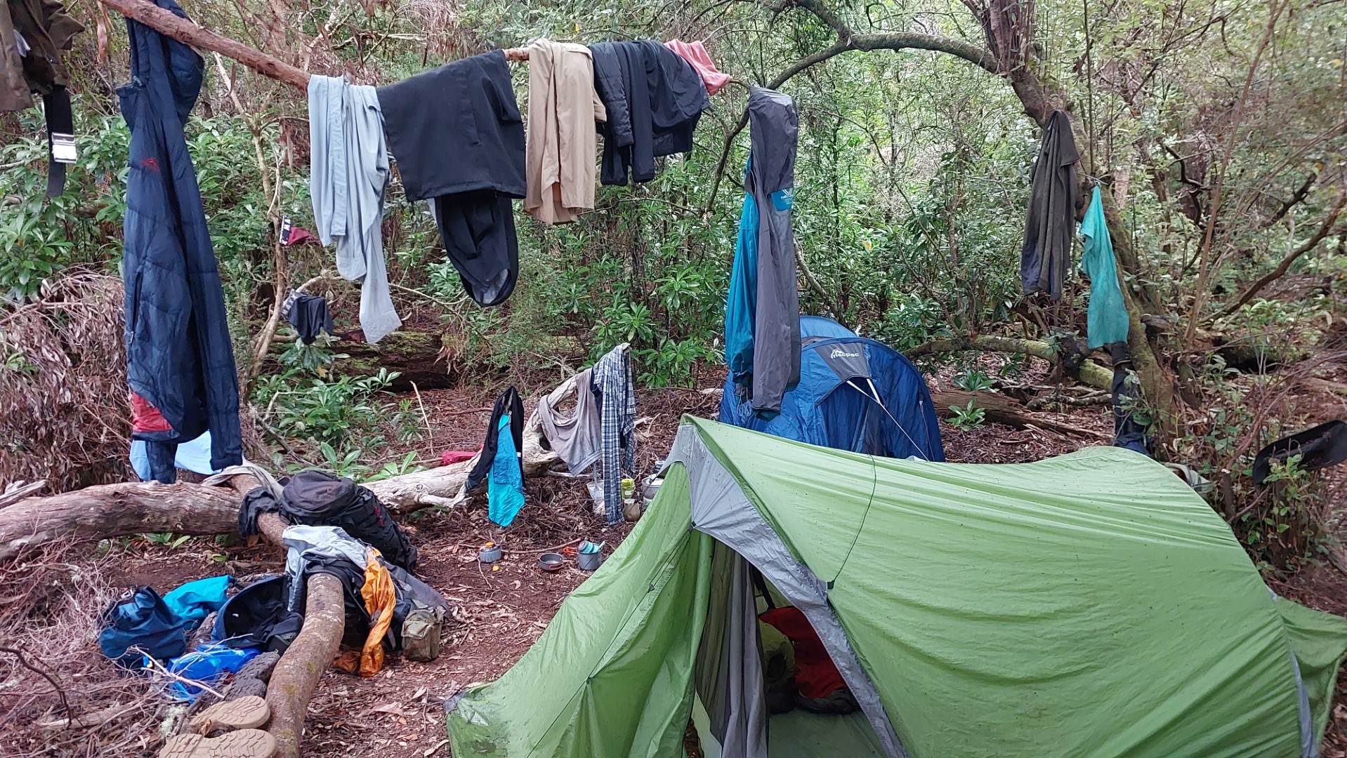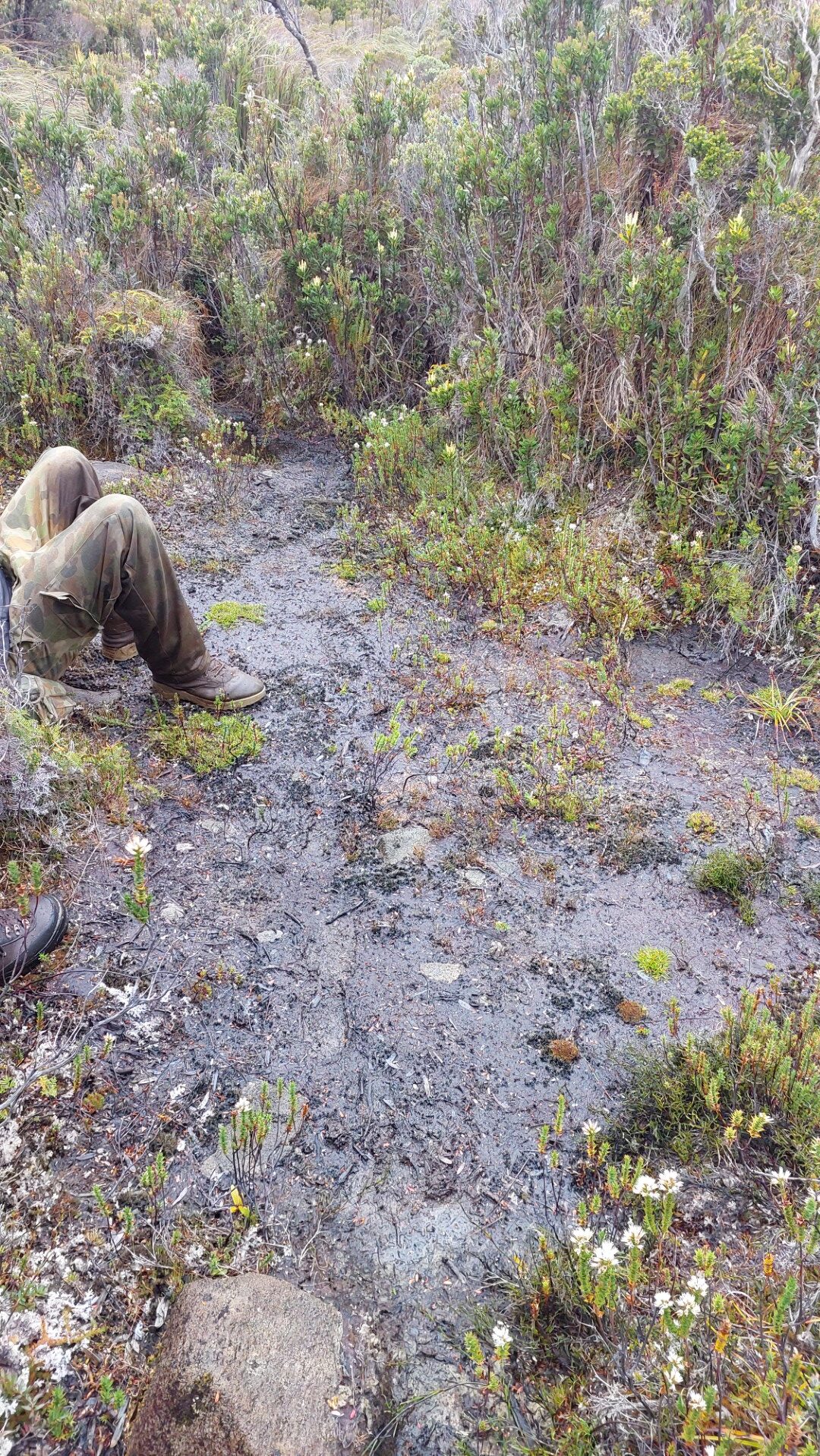 We eventually descended into the saddle, crossing through some weird tree/vine terrain filled with potholes of knee-deep mud, stumbling into our lovely campsite bog at 7pm. Our water source for the night was surprisingly gourmet, from pools about elbow deep and only mildly stagnant. (The weather is “Weirdly Dry” of course).