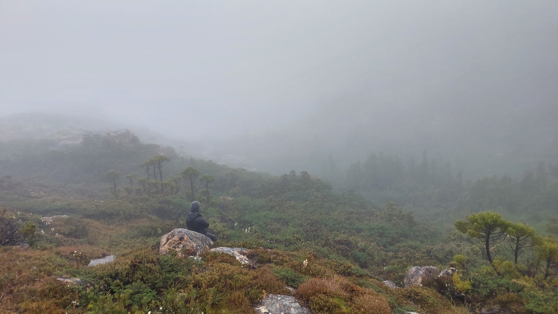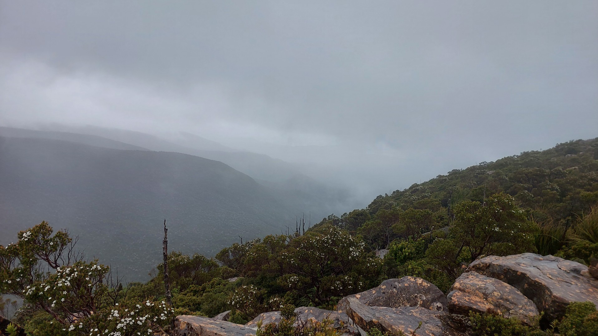 Unfortunately as if a present from the gods for approaching the top of Pindars Peak, the weather turns to crap, with rain and thick fog covering everything around us. I check the InReach forecast - so much for "sunny and low winds". Chapman mentions a sidetrip to the true summit of Pindars Peak, with the caveat "In fine weather the views of the coast and the Southern Ranges are excellent". Paired with our late start, the non-fine weather suggests us to give the peak a miss.