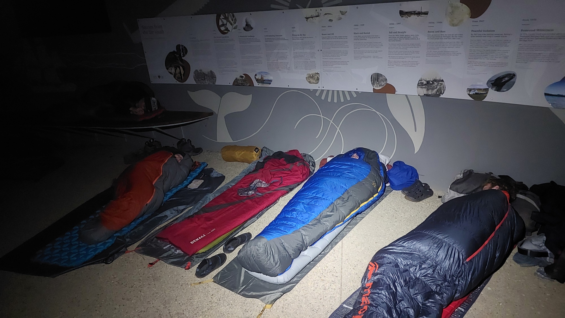We (allegedly) just slept under the visitor information shelter to avoid the rain, and got picked up the following day at 9am.