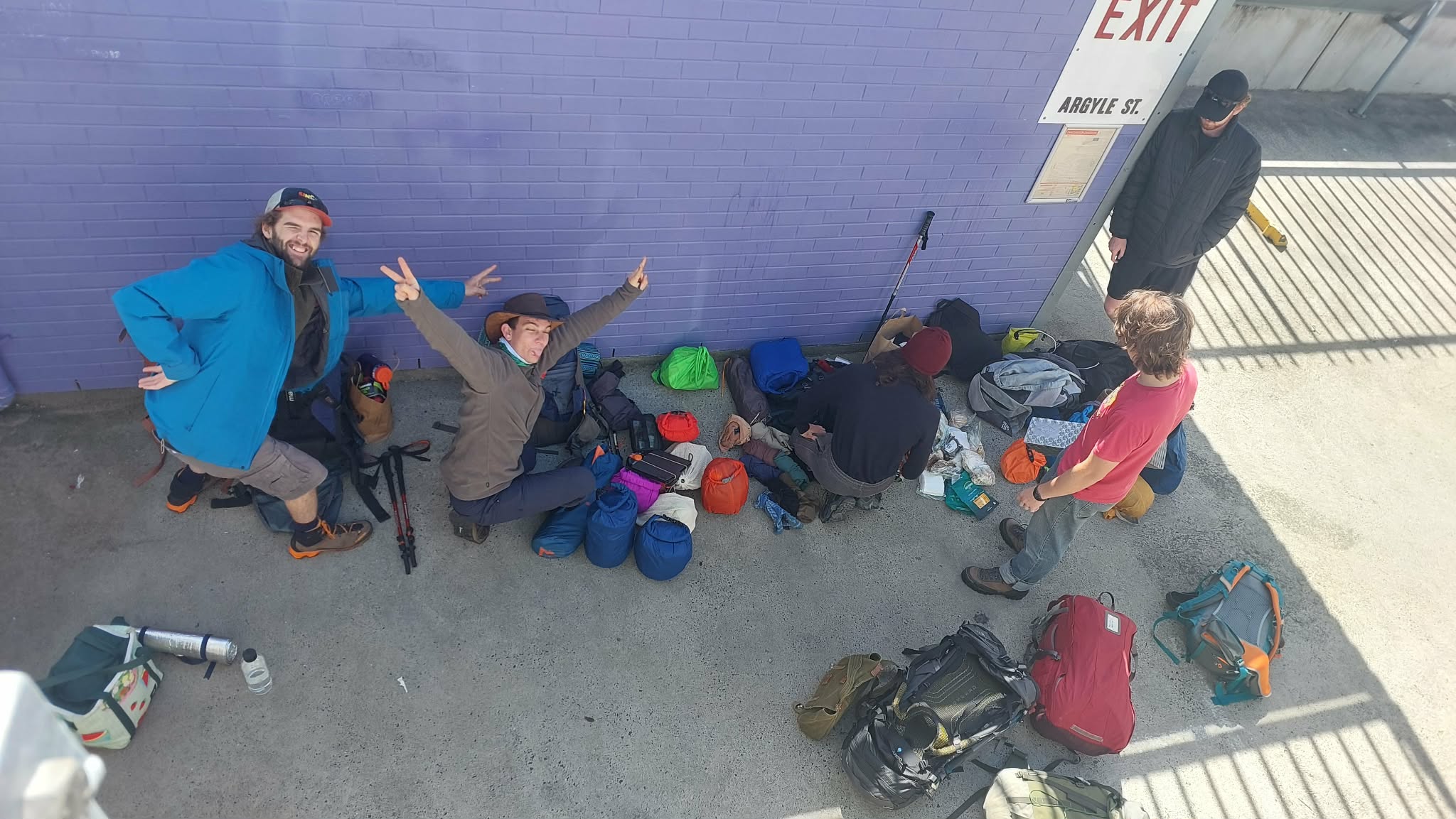 Gear check in a Hobart Parking Lot. Our backpacks ranged 21-26kg including 4L of water at the start of the trip.