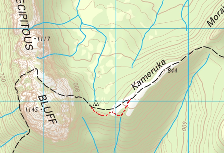 We were excited to see a surprisingly large hut and carpark at the trailhead, and the logbook indicated that the track was potentially more travelled than initial expectations3. A total of 15 people(!) had attempted the Southern Ranges Traverse in the previous month, but we were the largest single group by far. The map at the hut showed the walking track route as far as Pindars Peak, after which it was just denoted by a big black arrow pointing vaguely northwest.