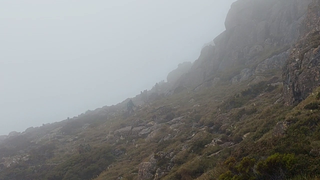 It’s basically a canyoning trip at this point, where our path has become a river which we are following downhill. Visibility becomes worse as the rain and fog becomes stronger, and despite being the closest to PB we have in the entire trip, we get the least views of it.