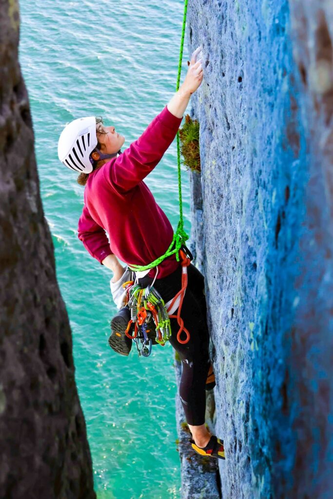 “Mercedes R focusing on the next sequence of moves with the ocean crashing beneath her”